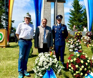 Der Volksbund-Landesverband Bayern legte gemeinsam mit 20 weiteren Organisationen, Verbänden und Institutionen bei dieser zentralen Gedenkfeier einen Kranz nieder. Das Kranzgeleit bildeten der Bundeswehrbeauftragte des Landesverbandes Bayern, Heinrich Stadelmaier, Oberstleutnant a.D., der Schul- und Bildungsreferent Maximilian Fügen, Hauptmann d.R. und der ehemalige Bezirksgeschäftsführer München Thomas Koterba. Musikalisch umrahmt wurde die Feier durch das Gebirgsmusikkorps der Bundeswehr unter Führung von Hauptmann Rudolf Piehlmayer.