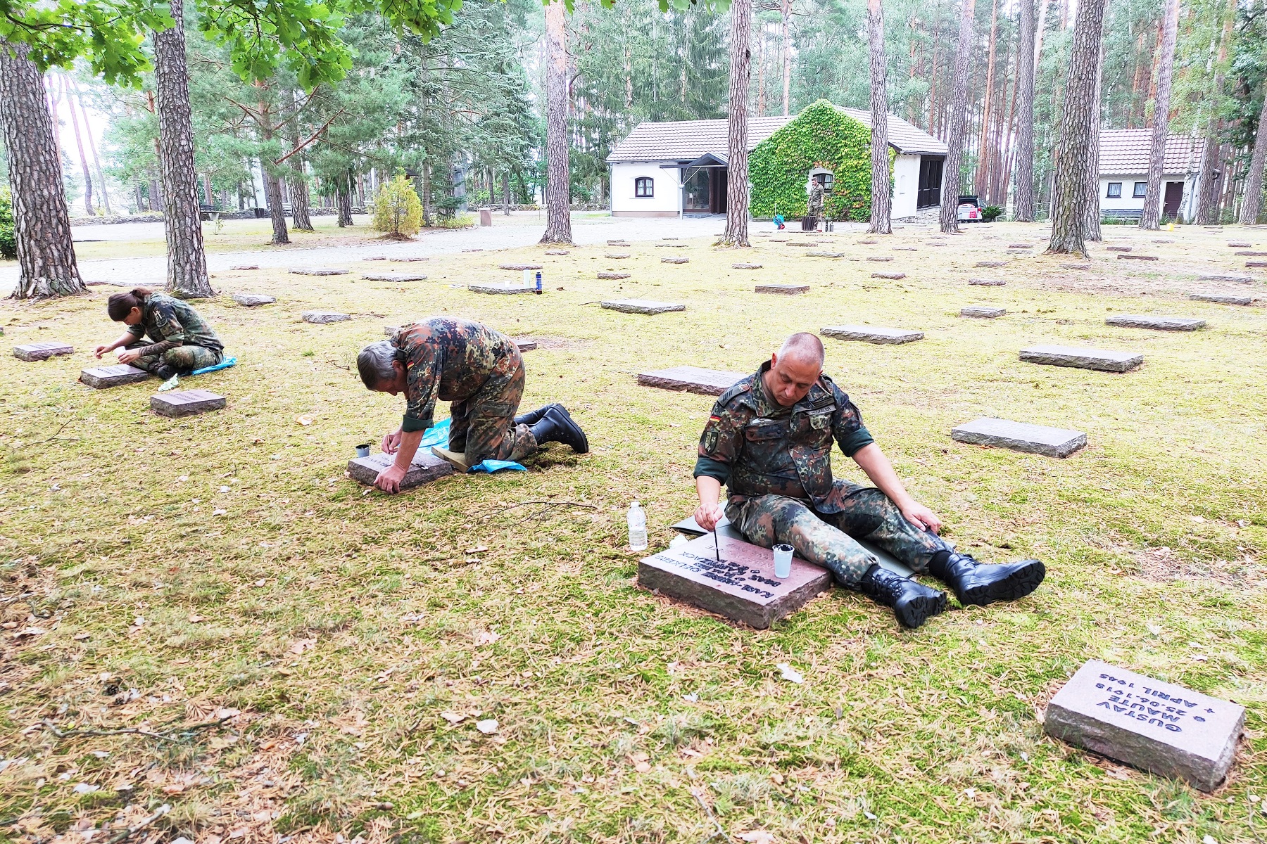 Zu diesen Unterstützern gehören auch die seit Jahren für den Volksbund tätigen Reservisten der Kreisgruppe Oberbayern-Nord im Verband der Reservisten der Deutschen Bundeswehr (VdRBw) e.V. Der diesjährige Kommandoführer, Stabsunteroffizier d.R. Dipl.-Ing. Wolfgang Christmann, Ingolstadt, erneuerte mit seinen Männern die Inschriften mehrerer Grabsteine, reinigte Dachflächen und befreite diese von Laub und Reisig. Christmann lobte die Zusammenarbeit und insbesondere die klare Kommunikation mit den Volksbundmitarbeitern vor Ort in Halbe und den generell hohen, allseitigen Organisationsgrad der Aktion. Sehr zufrieden schienen auch die anderen Teilnehmer des Arbeitseinsatzes gewesen zu sein; Oberstabsfeldwebel d.R. Alfred Veeth, ein langjähriger Teilnehmer der Gruppe, der auch mit anderen Reservistenkameradschaften Arbeitseinsätze absolvierte, wörtlich: „Wolfgang Christmanns Arbeitseinsätze gehören zu den bestorganisiertesten und kameradschaftlichsten, an denen ich je teilgenommen habe.“