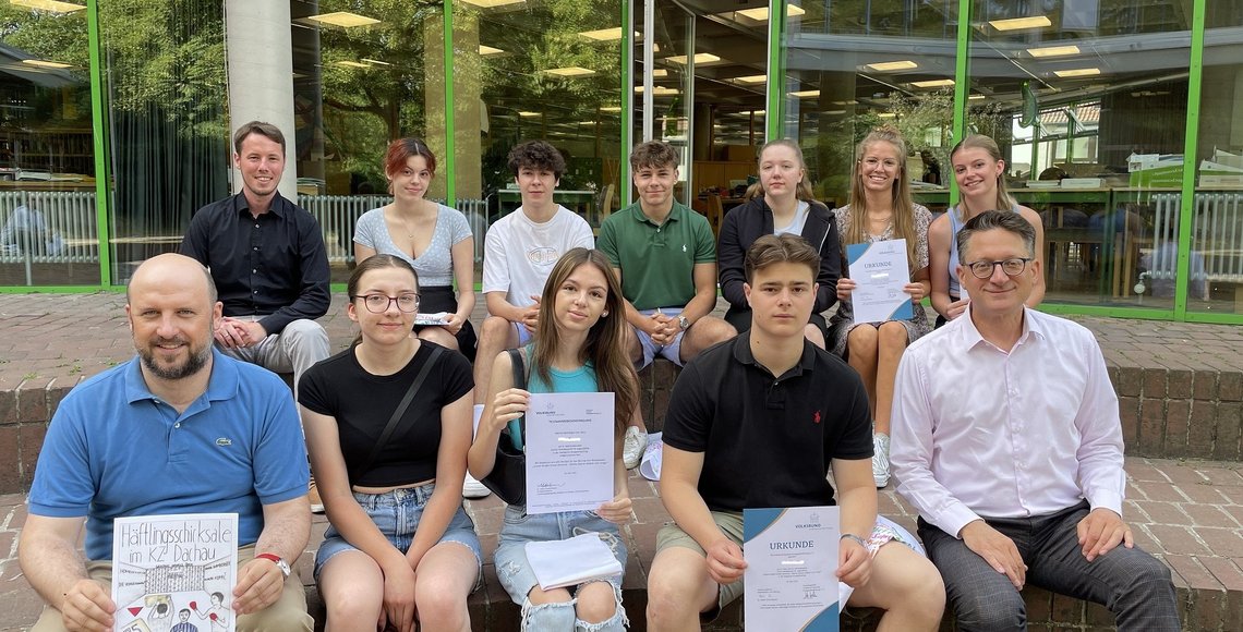 Nun erhielten die Schülerinnen und Schüler des Oberstufenseminars ihre Urkunden und Preisgelder durch den Bildungsreferenten des Landesverbandes Bayern, Maximilian Fügen, überreicht. Die beiden ausgezeichneten Beiträge setzten sich mit den Verfolgtengruppen der Homosexuellen und der sogenannten „Asozialen“ innerhalb des KZ-Systems auseinander. Hierzu sagte Fügen in seiner Laudatio: „Beide Comics zeichnet aus, dass sie nicht nur die Verbrechen in der NS-Zeit thematisieren, sondern auch auf die ungerechte Behandlung beider Opfergruppen bis in die jüngste Vergangenheit hinein eingehen. Der sogenannte „Homosexuellen Paragraph“ 175 wurde erst 1994 abgeschafft und erst 2002 wurden die Urteile gegen Homosexuelle in der NS-Zeit durch den Bundestag aufgehoben. Die Anerkennung von sogenannten „Asozialen“ als Opfergruppe der Nationalsozialisten erfolgte sogar erst 2020. Ihr habt mit euren Comics einen wichtigen Beitrag gegen das Vergessen und für eine zeitgemäße Gedenkarbeit geleistet.“